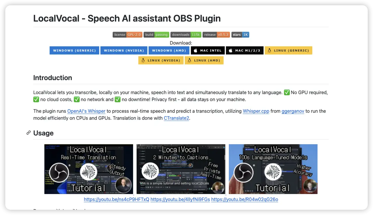 - 下载与安装: 前往LocalVocal的官方发布页面,根据您的操作系统(Windows, macOS, Linux)和硬件配置(如NVIDIA, AMD或通用版本)下载对应的安装包并完成安装。