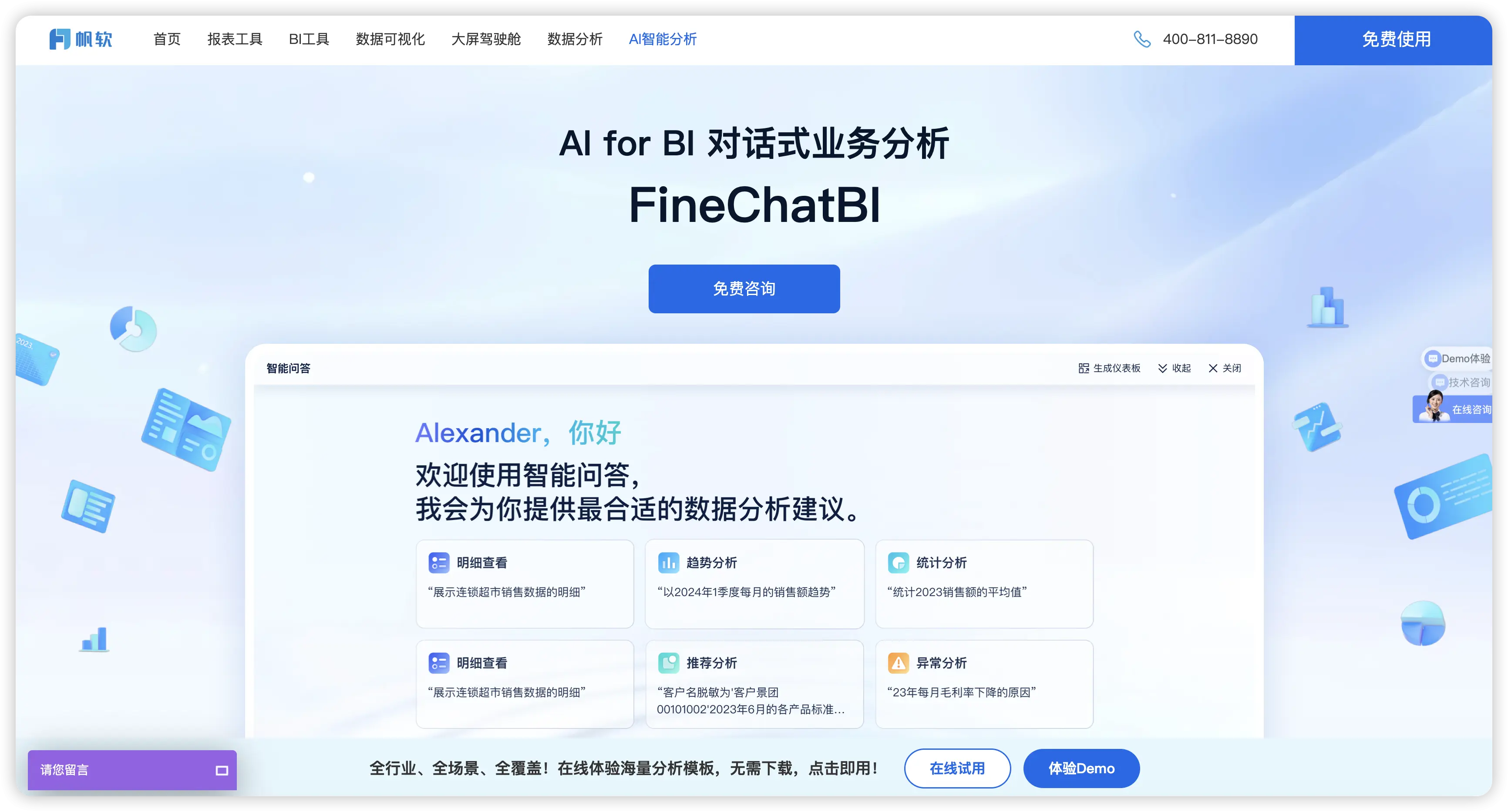 - AI智能解析:平台自动解析问题意图并生成分析方案