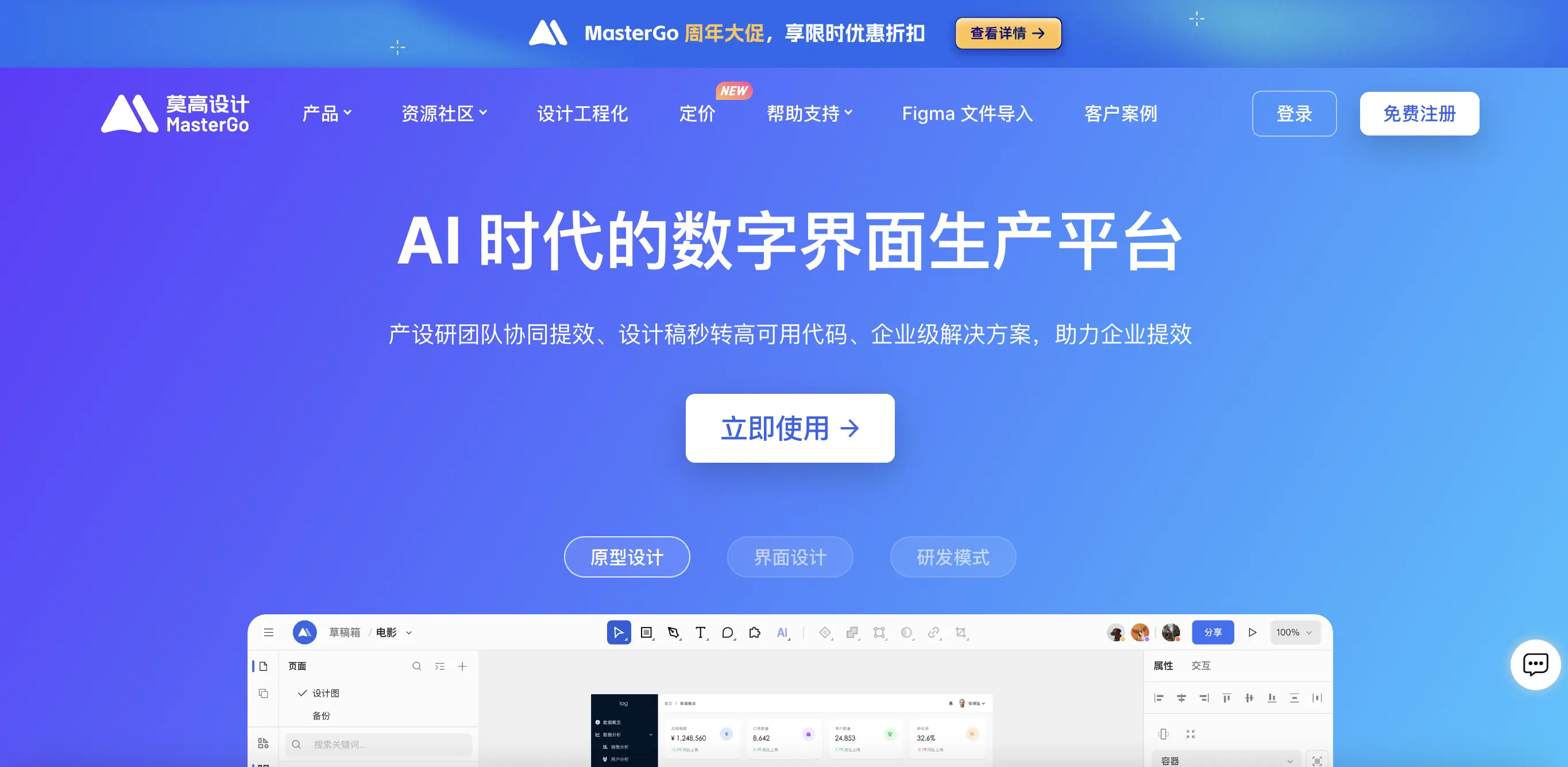 MasterGo是一个专业的在线UI/UX设计协作平台,致力于为产品经理、设计师和研发工程师提供一体化的数字界面生产解决方案。作为AI时代的数字界面生产平台,MasterGo通过智能化的设计工具和云端协作技术,重构了传统的产设研工作流程。